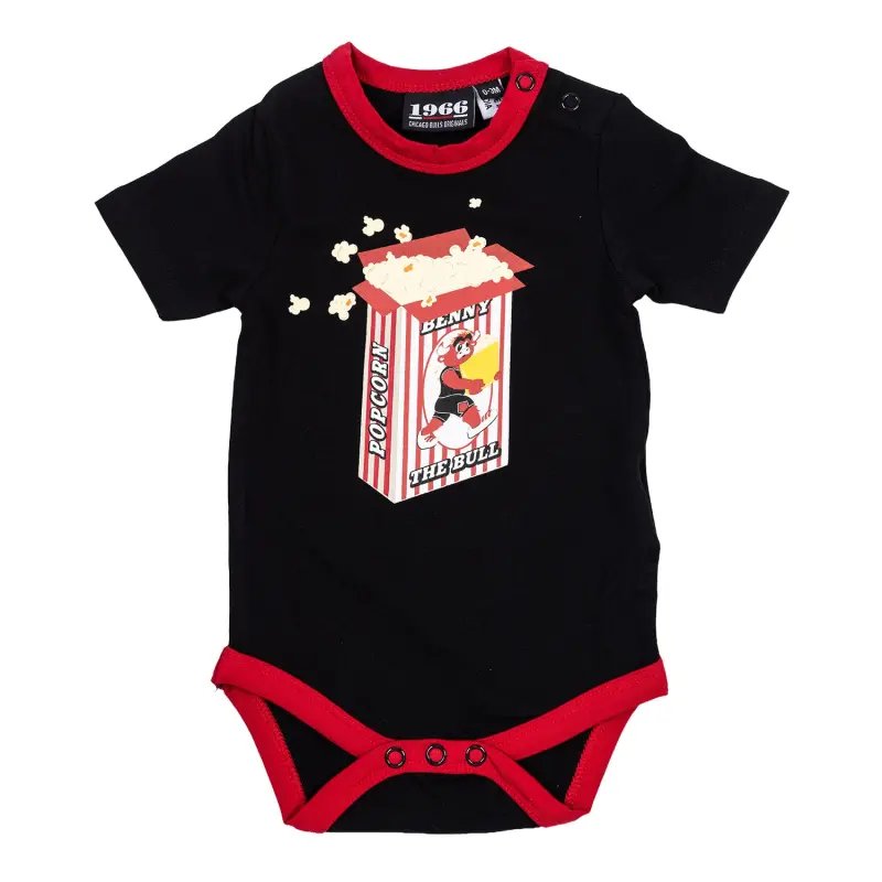 Snack time meets game time in this cozy and playful newborn onesie from Sport Design Sweden. Made from 100% ultra-soft cotton, this onesie features a bold box of overflowing popcorn graphic on the front—perfect for your little fan’s first big game day. A special touch on the back tag reveals the head of Benny the Bull, adding a fun nod to the team’s beloved mascot.